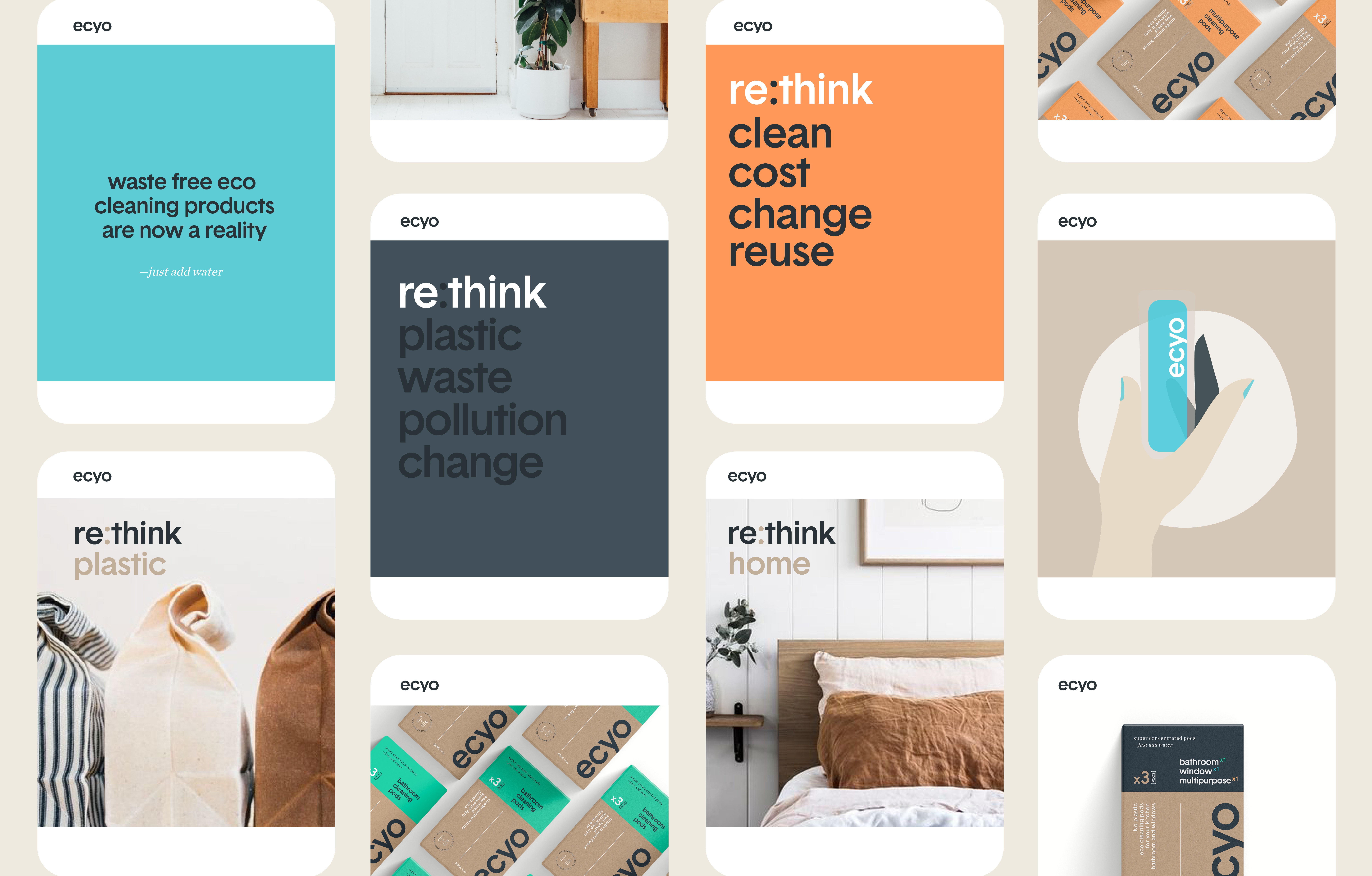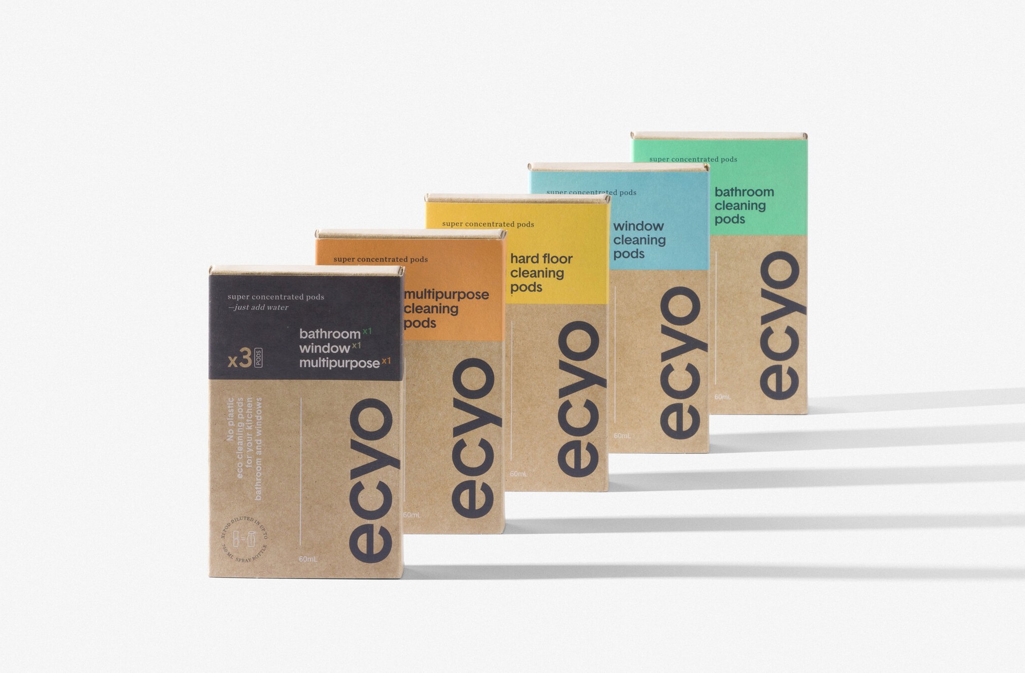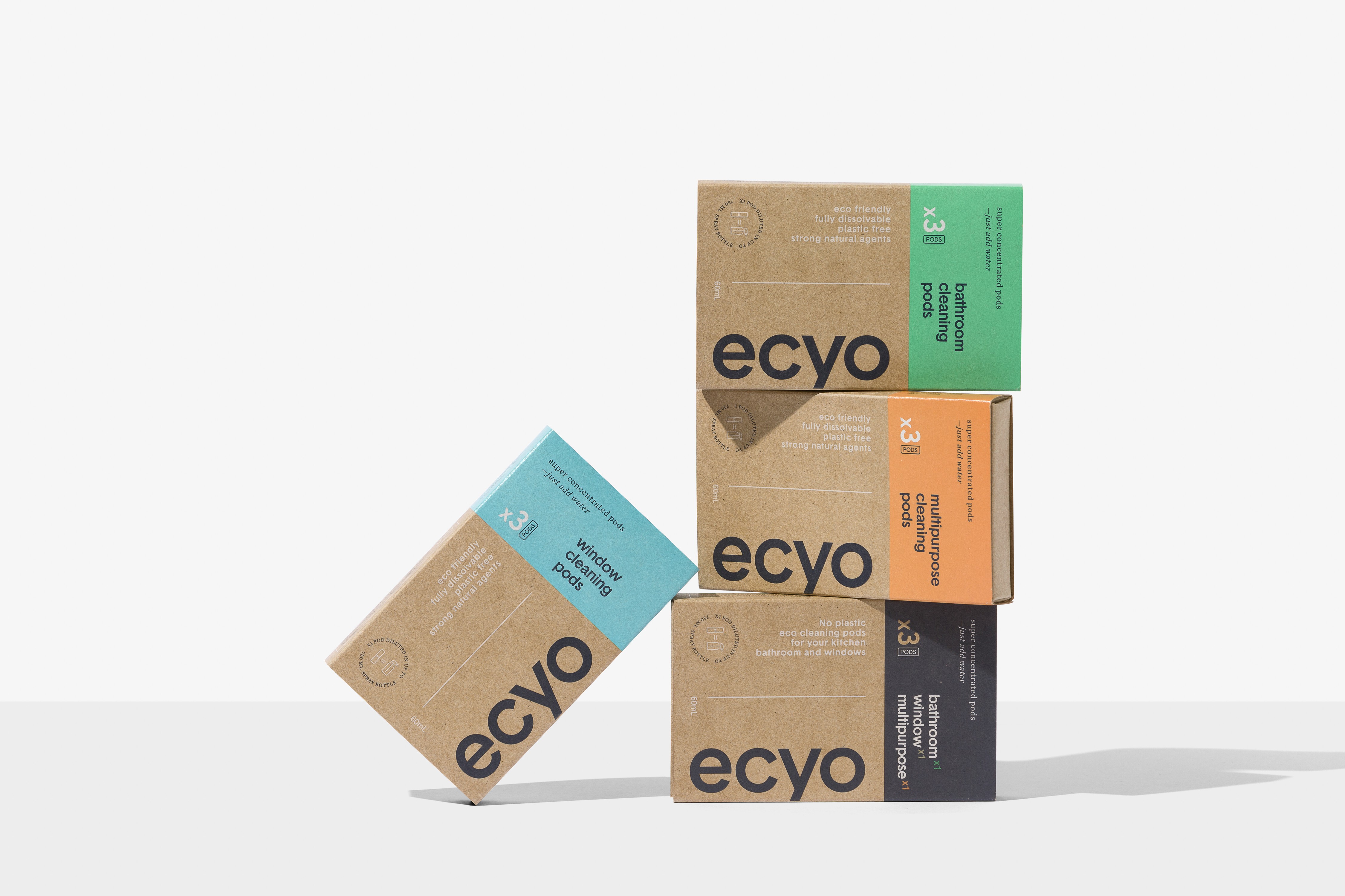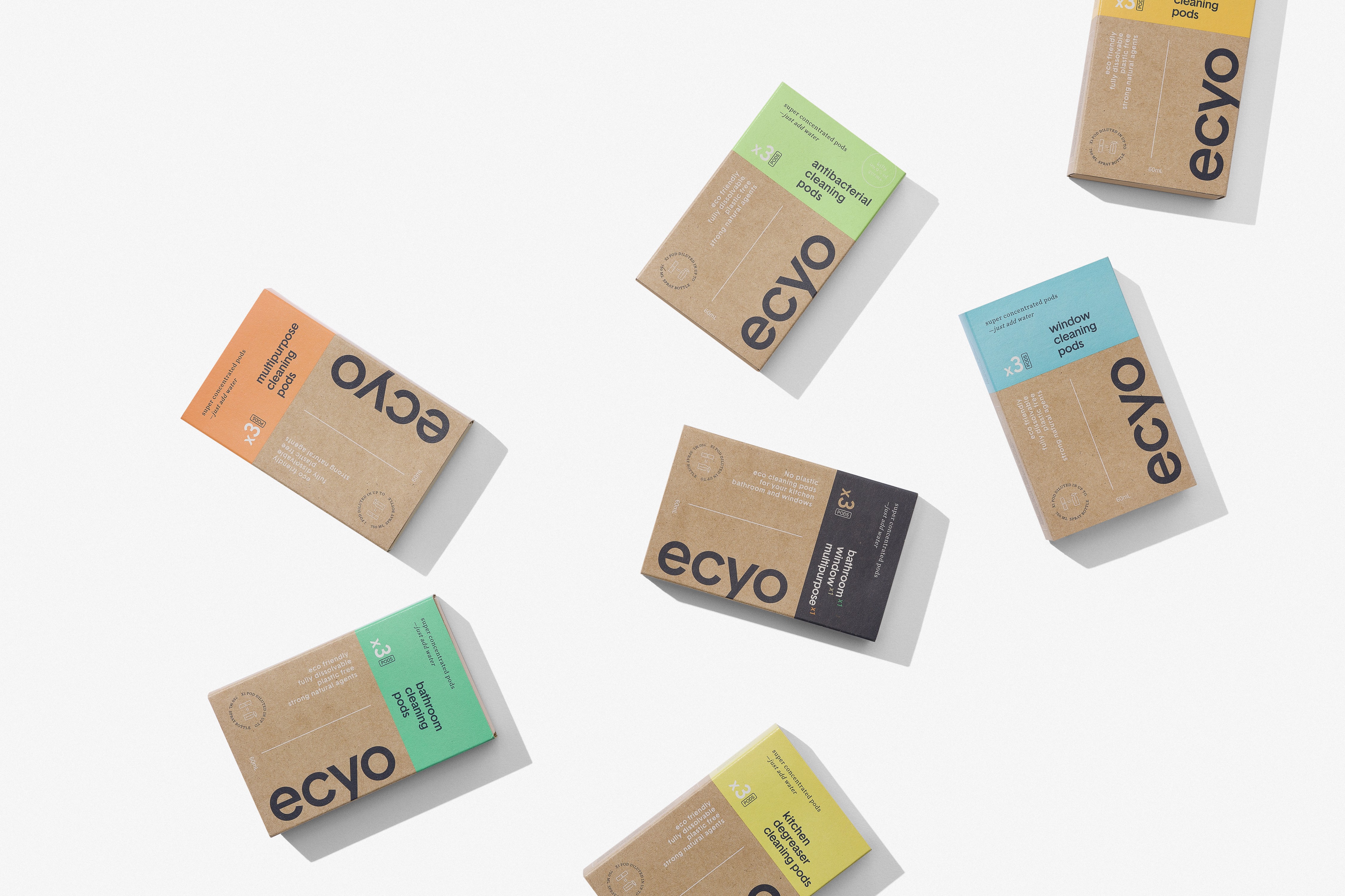 ecyo is an environmentally friendly cleaning brand with a simple mission: remove single use plastic from the planet, reduce carbon in the atmosphere and lessen waste anxiety, one household at a time. We designed a range of packaging to further emphasise ecyo’s guiding principles. Printed on natural fibre cardboard, we paired a clean, strict typography with an easily identifiable colour coded system, making ecyo’s environmental mission clear and easily identifiable to consumers.