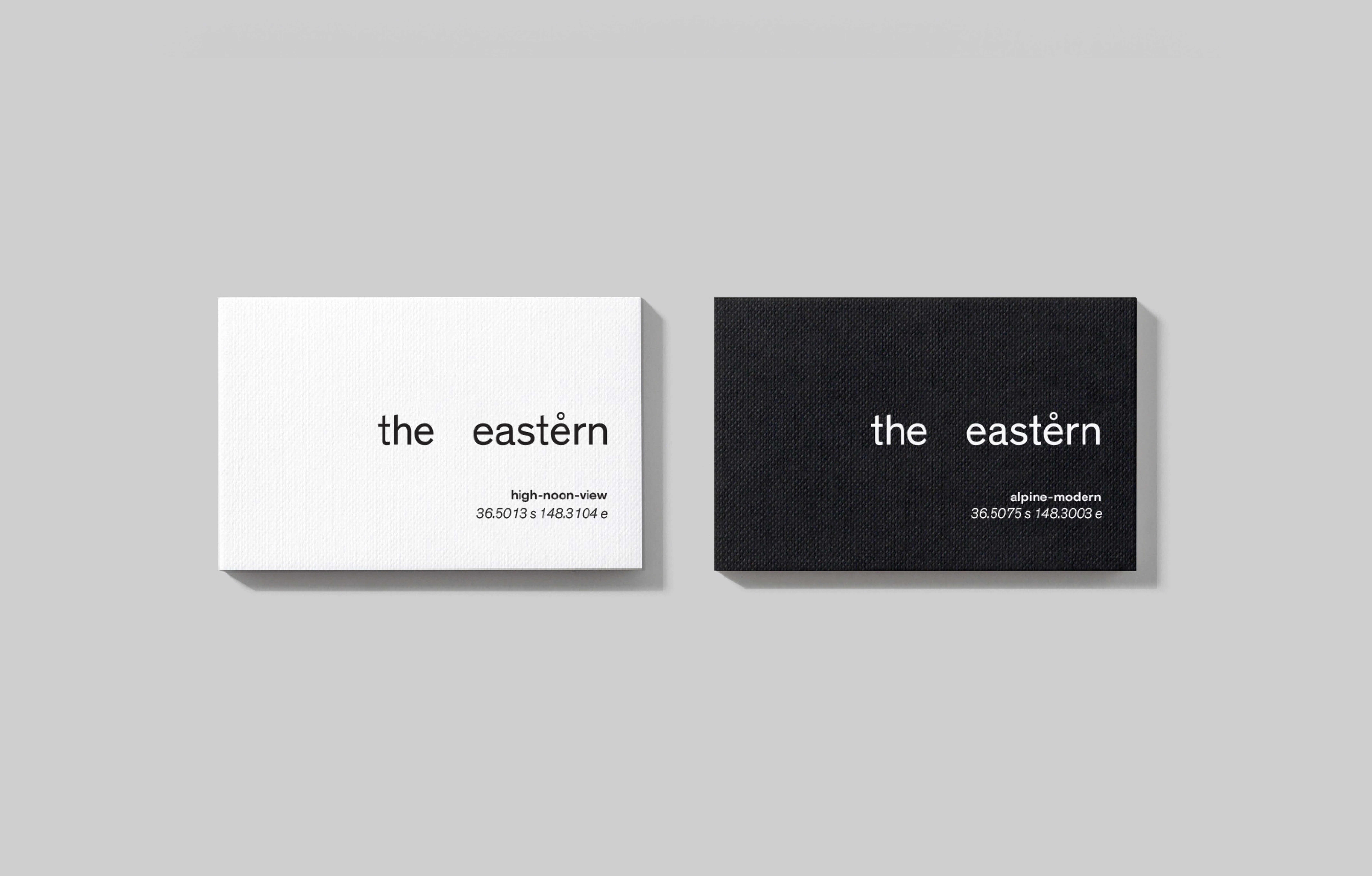 Located on the eastern edge of Thredbo Village, The Eastern is a boutique accommodation offering made up of two architecturally designed cabins – crafted with the modern, design-savvy traveller in mind. Our task was to develop a brand identity that felt minimal yet clever, something that would resonate with a sophisticated audience seeking style, comfort, and a strong sense of place. The branding plays on subtle cues: the exaggerated spacing between the words draws focus to the east, while the degree symbol serves as a quiet nod to the property’s unique location. It’s a refined identity that mirrors the essence of the cabins themselves – purposeful, elevated, and effortlessly elegant.